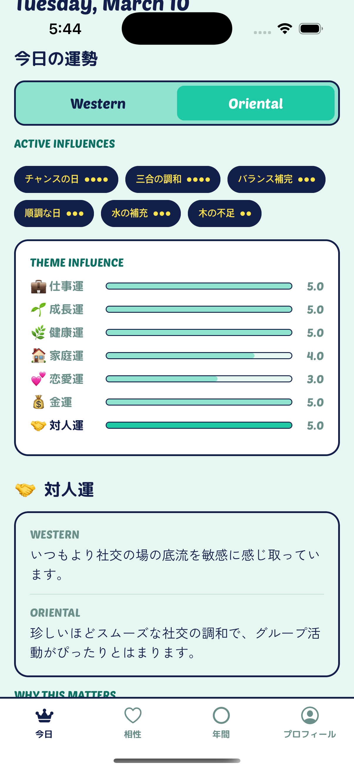 毎日、7つの主要テーマの中からあなたに最も関連のある分野をお知らせします。西洋占星術と東洋占星術(四柱推命)の両方の視点で比較し、実践すべきことと避けるべきことを含むコーチングサマリーをお届けします。
